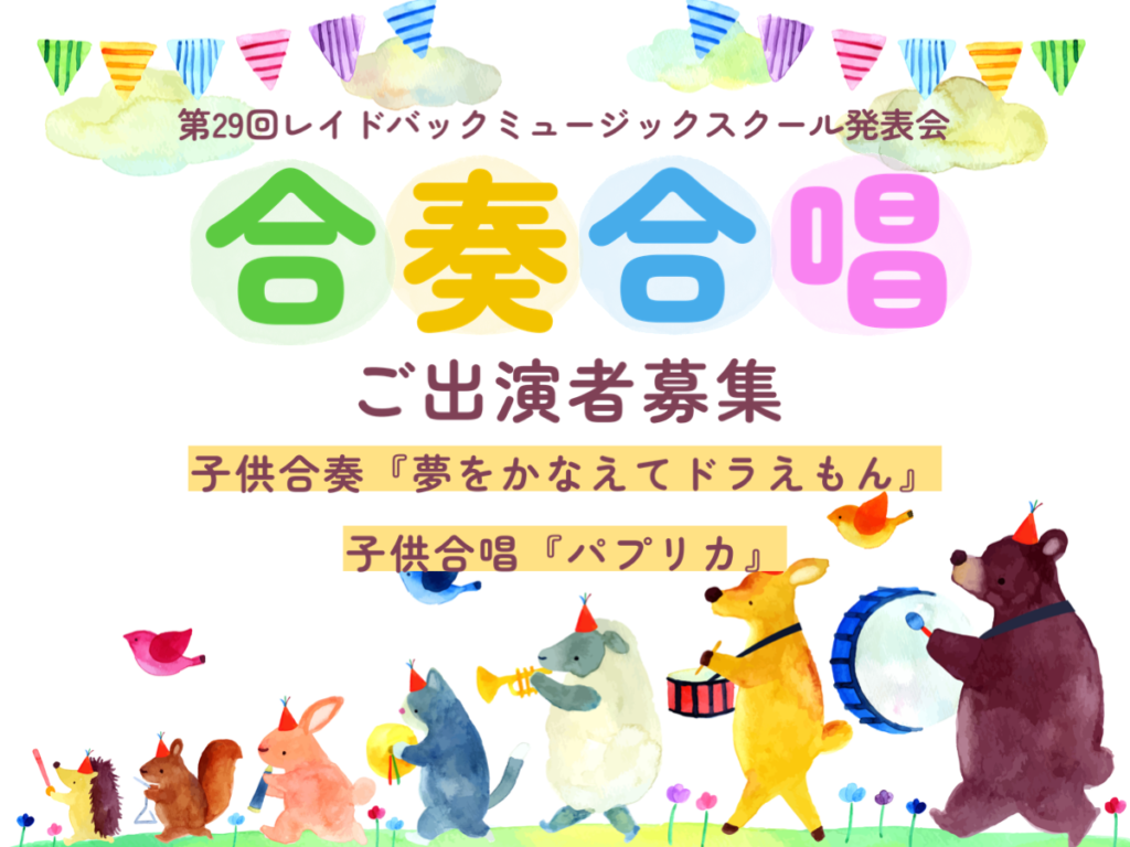 2023年8月27日に開催致します第29回レイドバックミュージックスクール発表会ではコロナ禍ぶりに子供合奏合唱を行います!!